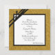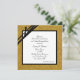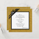Chic wedding rehearsal dinner invitation done in a square shape, with graphics of a gold glitter looking background. A square black framed white text area, in the middle of the invitation, has graphics of a black knotted ribbon, in the upper left corner. Personalise all the text for your wedding party. Matching RSVP cards are available.