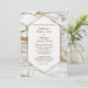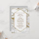 The background for this attractive and elegant formal wedding invitation is a white marble image with faux antique gold glitter threaded through it. At the center is a white hexagon banner framed in shiny gold. Your wedding text is in dark antique gold at the center, and there is plenty of room for your customization. The back of the invitation is solid medium gray. Elegant for formal weddings in any season!