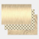 Three distinct styles of gold sheets of wrapping paper. The first is a shimmery ombre shaded gold gradient pattern with a nice gold sheen and the next is dark snall gold glittery circles on a tan backdrop then the third is gold glitter streaks on a tan backdrop for contrast. Gold festive chic vibes