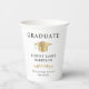 Elegant graduation party paper cups featuring a gold grad cap, and "Graduate" and the graduate's name, school and class year in classic serif typography.
