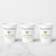 Elegant graduation party paper cups featuring a gold grad cap, "Congratulations" in a classic script, and the graduate's name, school and class year in modern serif typography.
