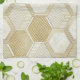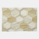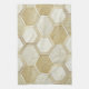 A seamless geometric pattern kitchen towel featuring a refined grid of hexagonal shapes outlined in metallic gold. Each hexagon contains intricate designs such as parallel lines, cross-hatching, and abstract geometric motifs. The background blends soft cream and beige tones with a subtle marble-like texture, creating a sophisticated, luxurious aesthetic.