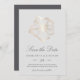 Notify guests of your upcoming destination, beach, or tropical island wedding with these beautiful summer save the date cards featuring a faux gold foil hibiscus flower illustration on a soft pastel gray background. Elegant dark gray script and block lettering displays your wedding details (names, wedding date, location, and website).