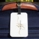 A minimalist gold and black monogram stylish luggage tag on a white background, with a serif typography initials and serif name. Elegant style to dress up your travel accessories.