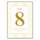 This elegant wedding table card features a minimalist design with a large, bold number "8" as the focal point. The color palette includes rich mustard gold accents against a soft cream background with subtle vertical stripes, creating a warm and sophisticated look. The typography combines a cursive font for "table" with clean sans-serif fonts for names and date, ensuring readability and balance. Perfect for formal occasions, this card exudes refinement and celebration, making it an ideal addition to any wedding reception.
