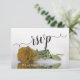 This RSVP card features a beautiful design with a gold coloured rose lying on its side next to a pool of water where you cans see the flower reflected with ripples and waves. The title is written in lacy script calligraphy. The back of the card is designed for your guests to fill out either accepting or declining your invitation and indicating their choice of meals. There is space to enter a webpage address so your guests can also respond online.