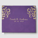An elegant rich purple and gold damask wedding guest book. This wedding guest book is part of a wedding invitation set.