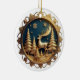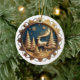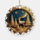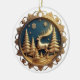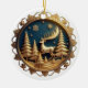 This customisable round ceramic reindeer ornament features an elegant White & gold coloured frame that encircles a gold festive design. The background showcases a serene Christmas snowy night scene, with a dark blue sky filled with snowflakes. Below, a picturesque scene of a winter snowy landscape with trees and snow. Gold deer with antlers gracefully adds a touch of magic and Xmas holiday spirit. The double-sided design ensures that no matter how the ornament turns, it always looks festive and complete. 🦌🎄