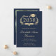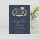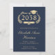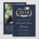 Elegant dark navy blue college graduation announcement featuring the graduate's class year in a light gold illustration of a laurel crest incorporating a grad cap topper and diploma, their name in a light gold classic script, and their school, major, honours or future plans. Add their photo and a personalise message on the back.