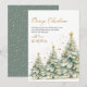 Modern Elegant Gold Calligraphy Script Christmas Tree Non Photo Christmas Cards. This festive simple minimalist Christmas Holiday cards features 3 watercolor christmas tree with decoration gold balls and confetti and a „Merry Christmas” greeting text which is written in a nice hand lettered font type in gold and white. On the reverse side golden glitter snow or sparkling gold confetti on dusty green background. This festive Custom Personalised Christmas Cards are a great way to remind loved ones that you're thinking of them this Winter Holiday Season.