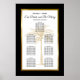 Add your own special touch to this elegant design featuring modern script and black text including an artistic gold palm tree silhouette with a metallic gold copper frame. This seating chart design features the bride and groom's names along with the words "Eat, Drink, and Be Merry" and "Please Find Your Seat". Templates are provided for up to seven tables with up to 8 or 9 names per table.