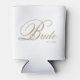 Bride can cooler. Elegant gold script Bride on a white background with wedding date in classic block text at bottom right. The wedding date can be removed by clearing the text field, or personalised with bride name or bride and groom initials.