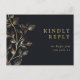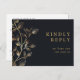 An elegant golden floral RSVP card with chic gold typography. The reverse features your details and a fun guest song request. Designed by Thisisnotme©