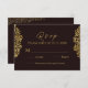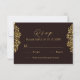 This RSVP card carries an elegant and luxurious aesthetic that perfectly complements the wedding invitation set. The background is a deep, rich brown, which enhances the golden damask patterns placed symmetrically on both sides.