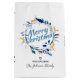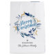 This elegant Christmas gift bag features a wreath with golden reindeer and blue and grey greenery. Merry Christmas is written in a beautiful handwritten script.