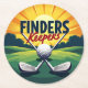 This vibrant and stylish design features a scenic golf course at sunrise, with the phrase "Finders Keepers" prominently displayed. The image showcases two crossed golf clubs and a golf ball in the foreground, set against a backdrop of lush green fairways and a radiant sun. Perfect for golf enthusiasts, this artwork captures the essence of the sport with a touch of humour and elegance. Ideal for birthdays, parties, or any golf-related event, this design appeals to both casual players and seasoned pros. The modern and classic elements make it a versatile choice for various occasions.