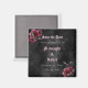 Dark and moody Save the Date magnet with Till Death Do Us Part saying, dark red roses, bats and spider webs. Has a smoky black watercolor background. Blackletter typography adds to the gothic feel of the announcement. See our coordinating items as well.
