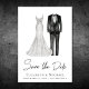 Elegant and chic no photo save the date announcement featuring watercolors of a bridal gown and groom's tuxedo and "Save the Date" in a stylish script. Add your names, wedding date and location in modern typography.