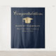 Elegant blue graduation party welcome tapestry and photo prop featuring a gold grad cap, "Congratulations" in a classic calligraphy script and the graduate's name, school and class year in modern serif typography.