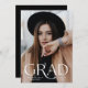 Modern graduation announcement featuring the graduate's full-bleed vertical photo on the front with "Grad" displayed in an elegant white text overlay. Personalise the front of the simple graduation announcement with the graduate's name and graduation year. The announcement reverses to display an additional photo with your personal message shown below. The 2 photo graduation announcement is perfect for both high school and college graduates.