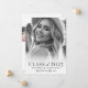 The back showcases a three-photo collage or photo band, along with the graduate’s name, school, and space for a personal message highlighting accomplishments and future plans. The design continues with a white background and dark grey fonts, creating a harmonious and sophisticated vibe. Fully customisable to suit your style or match school colours.