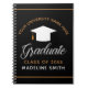 These classy black and gold custom college or high school graduation party keepsake notebooks feature classy white typography under a grad cap for the class of 2025. Customise with your graduating year under the chic calligraphy. A perfect gift for a graduate to plan their future plans for grad school or university.