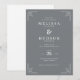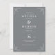 This elegant wedding invitation features a sophisticated, muted gray background with crisp white text and decorative Greek key motifs in the corners. The layout is centered and symmetrical, emphasizing clarity and balance, while the clean serif typeface adds a touch of formality and tradition. The design conveys an atmosphere of timeless elegance, perfect for a formal celebration, with ample spacing that enhances readability and visual appeal. Ideal for couples seeking a classic yet understated aesthetic, this invitation sets the tone for a memorable event.