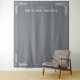 This elegant wedding backdrop features a minimalist design with a muted gray background, creating a sophisticated and timeless atmosphere. The layout includes stylish leaf motifs in the corners, adding a touch of classic charm to the overall look. Customizable text fields allow for personalization with names and dates, making it perfect for your special day. The clean typography and balanced composition ensure that this backdrop is both versatile and visually appealing, ideal for capturing beautiful memories at your wedding celebration.