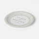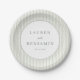 This elegant wedding plate features a minimalist design with vertical light gray stripes as the backdrop, creating a sophisticated and balanced look. The central circular frame highlights customizable names in a clean serif font, complemented by a simple sans-serif date below, all set against a harmonious grayscale palette. The modern yet understated style is perfect for contemporary weddings, conveying a mood of elegance and formality. Ideal for couples seeking a chic and timeless table setting that emphasizes simplicity and focus on the celebration.