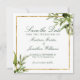 This elegant botanical Save the Date invitation is framed with beautiful green watercolor leaves and pretty olive vines. This lovely greenery and dark colour back is perfect for a chic fall event for a modern bride and groom. Framed with a lovely gold rectangle behind the green leaf accent.