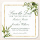 This elegant botanical Save the Date coaster is framed with beautiful green watercolor leaves and pretty olive vines. This lovely greenery and dark colour accent is perfect for a chic fall event for a modern bride and groom. Framed with a lovely gold square behind the green leaf accent.