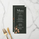 This wedding menu card features a simple and elegant floral and rustic botanical detail in burnt orange, on elegant dark olive green textured background. Ideal for a sophisticated, modern, simple and minimalist fall wedding.
