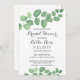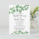Beautiful invitation features green eucalyptus leaves over clean white background on both front and back. Click to customise further to change font style, size or colour.