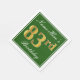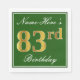 This simple and elegant paper napkin design features a message like "Name-Here’s 83rd Birthday" (with the "83rd" having a faux gold-like colouring) within a green-coloured square area featuring a simple border outline. The name is in a white-coloured script-like text, and can be personalised. Napkins like these could perhaps be used at a birthday party for somebody who is celebrating their eighty third birthday. [~Z0000137]