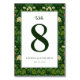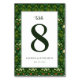 This wedding table card features a classic and refined design with a lush, garden-like floral border in deep forest green and cream hues. The central white panel showcases a bold, stylised number "8" in dark green, accompanied by elegant cursive and serif typography for a touch of sophistication. The botanical theme evokes nature and tranquillity, making it perfect for weddings or formal gatherings. Its timeless style and customisable elements ensure a personal and inviting atmosphere for any special occasion.