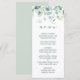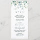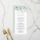 This wedding menu features painted watercolor eucalyptus, botanical green, and light blue leaves with modern calligraphy.