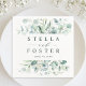 This wedding napkin features painted watercolor eucalyptus, botanical green, and light blue leaves.