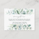 This wedding reception enclosure card features painted watercolor eucalyptus, botanical green, and light blue leaves with modern calligraphy.