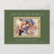Modern, elegant green and glittery gold Christmas holiday greeting postcard customised with your favourite family photo. Text says, "Joy to the World." Customise further by adding your own greeting and/or family name to the bottom. The back of this postcard has a return address and a customisable message. The green background colour of this card is customisable, as well.