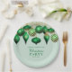 These elegant holiday party paper plates feature beautiful Christmas ornaments in green and gold with gold string lights on a soft green background. Text can be easily changed by clicking "Personalise". Perfect for those family or business holiday parties.
