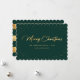 Elegant green and gold Merry Christmas card featuring a snow vignette on the front and green and gold stripes with falling snow at the back of the card. The gold foil effect is only simulated in the artwork.