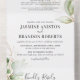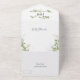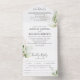 Elegant 3 in 1 greenery wedding tri-fold invitation featuring a stylish white background, botanical watercolor green foliage, gold glitter accents, your wedding details, a wedding invite, and an rsvp food entree postcard for your guests to tear off and send back.