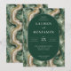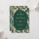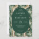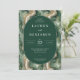 This elegant wedding invitation features a sophisticated oval design set against a marbled background with swirling patterns of green, cream, and gold. The deep forest green central panel is complemented by lighter shades and metallic accents, creating a luxurious and timeless aesthetic. The typography is clean and well-organised, using bold serif fonts for the names and a mix of uppercase and script styles for added elegance. Perfect for formal celebrations, this design conveys a mood of refinement and joy, making it ideal for significant life events like weddings.