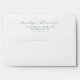 This elegant envelope features a minimalist design with a clean white background and soft green text. The layout is centered, showcasing an elegant cursive script for names followed by a simple serif font for the address, creating a balanced and sophisticated look. Perfect for formal occasions, this design emphasizes clarity and refinement through its use of typography and ample negative space, conveying a timeless and understated luxury.
