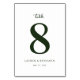 This elegant wedding table card features a minimalist design centred around a large, bold number "8" in deep forest green, creating a striking contrast against the white background. The layout is clean and modern, with ample negative space that highlights the central numeral and the delicate cursive script above it reading "table." Below the number, customisable placeholders for names and dates are presented in a sleek sans-serif font, adding to the contemporary aesthetic. The overall mood is one of understated luxury and sophistication, perfect for a modern wedding celebration.