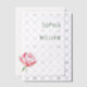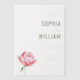 This elegant wedding invitation features a minimalist design with ample negative space, creating a clean and sophisticated look. The muted gray background is complemented by a soft green color palette used for the text, which includes a mix of bold serif fonts for the couple's names and smaller script and serif fonts for additional details. A single, beautifully illustrated pink peony adds a touch of natural elegance to the left side, balancing the textual content on the right. The overall style is refined and formal, perfect for a chic and memorable wedding celebration.