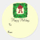 A pretty square wreath with lots of greenery and little red ornaments accented by a big red Christmas bow.  Customise as you desire.