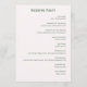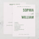 This wedding program features a minimalist and elegant design with a clean white background accented by light green text. The layout is vertically oriented, showcasing the names "Sophia" and "William" in bold, uppercase letters, complemented by a cursive "and" for added sophistication. The ceremony details are neatly listed in a sans-serif font, maintaining readability and simplicity. Customizable placeholders allow for personalization of dates and locations, making it perfect for any wedding celebration. The overall style exudes modernity and refinement, ideal for couples seeking a sophisticated yet uncluttered aesthetic for their special day.