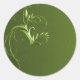 An elegant round envelope seal, this design features an ornate chartreuse flourish decoration set against a dark green background.