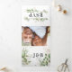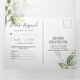 Elegant 3 in 1 greenery wedding tri-fold invitation featuring a stylish white background, botanical watercolor green foliage, gold glitter accents, a photo of the bride and groom, your wedding details, a wedding invite, and an rsvp food entree postcard for your guests to cut off and send back.